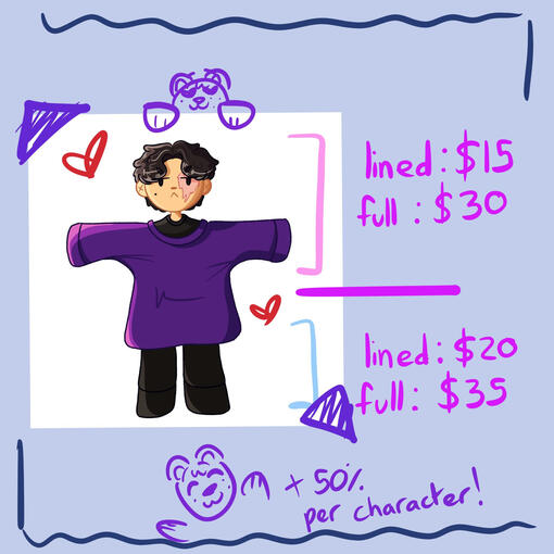 For other commissions such as LOGO DESIGN, I will charge by the hour ($25/hr).Please contact me through social media ([email protected] or through other socials)