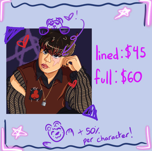 Throughout the commission process, I will send you several updates (rough sketch, clean sketch, lined/flat colors, finished); please be mindful of my time and communicate clearly with me during the process. I am happy to make as many changes as desired, but please express these to me as early in the process as possible.By commissioning me, you allow me the right to use the piece(s) for my portfolio and examples of my work. You may only use my art for personal use unless discussed otherwise. Thank you!